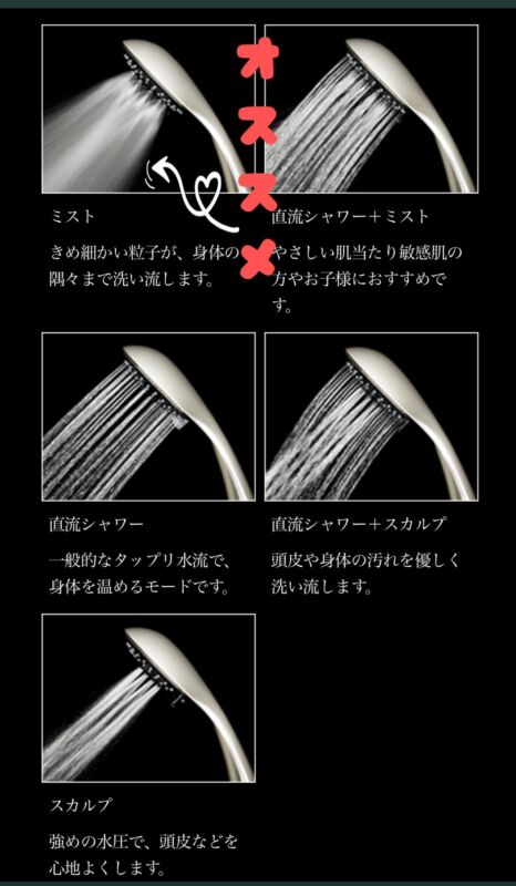 どのモードを使用してもらってもウルトラファインバブルなんですが、含有量が最も多いモードがミストモード。