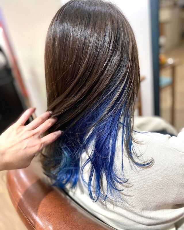 髪の中まで染めてくれる事で長持ちし、ブリーチ退色後の黄色やオレンジが気になりにくいネイビー💕🫐