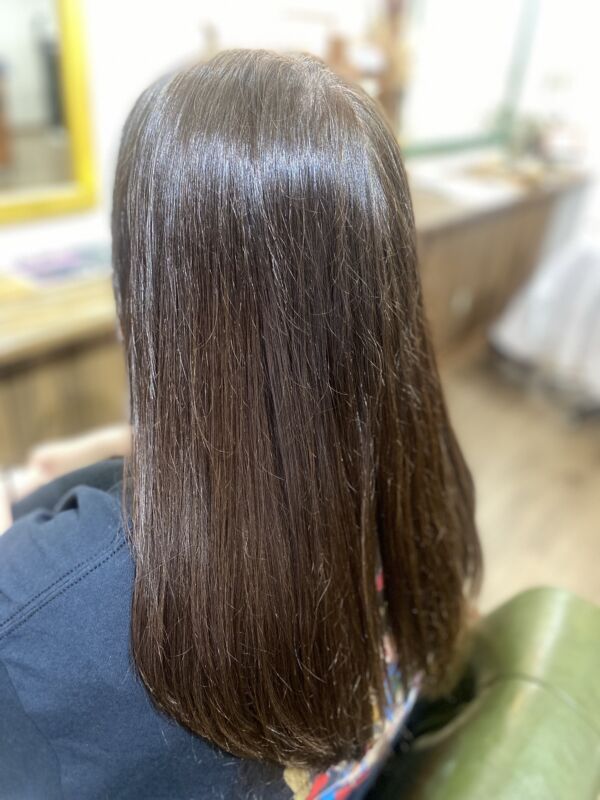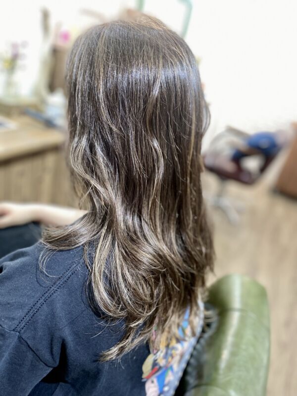 今回使用のカラー白髪染め一切使わずファッションカラーで染めています。毛先は、ハイライトを生かすように暗くならないカラーを塗布しています。