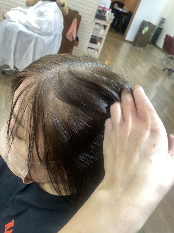 根本をしっかり染めると、1ヶ月後にくっきりとした白が浮き立ってきますね。白は、頭皮の色に近いのでTOPに白髪が多い人は特に頭皮が薄く感じます。今回のお客様は、この2トーンが気になり白髪ぼかしのハイライトを入れたいとご希望でした。