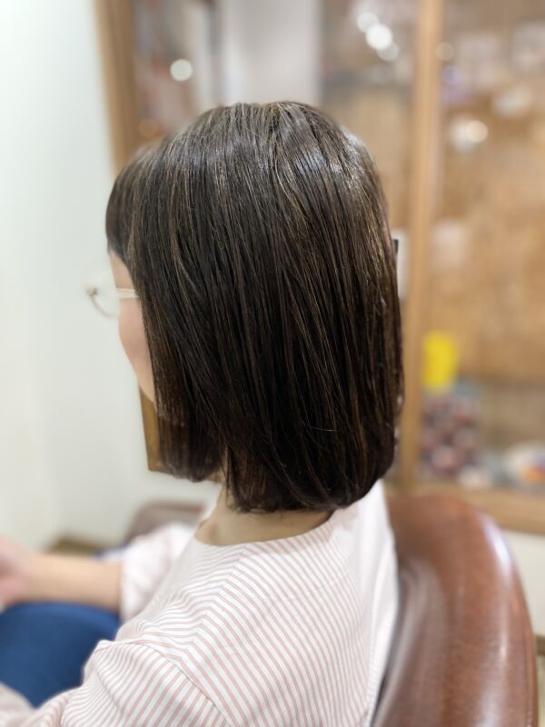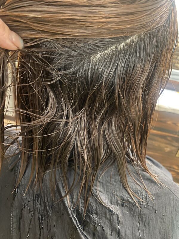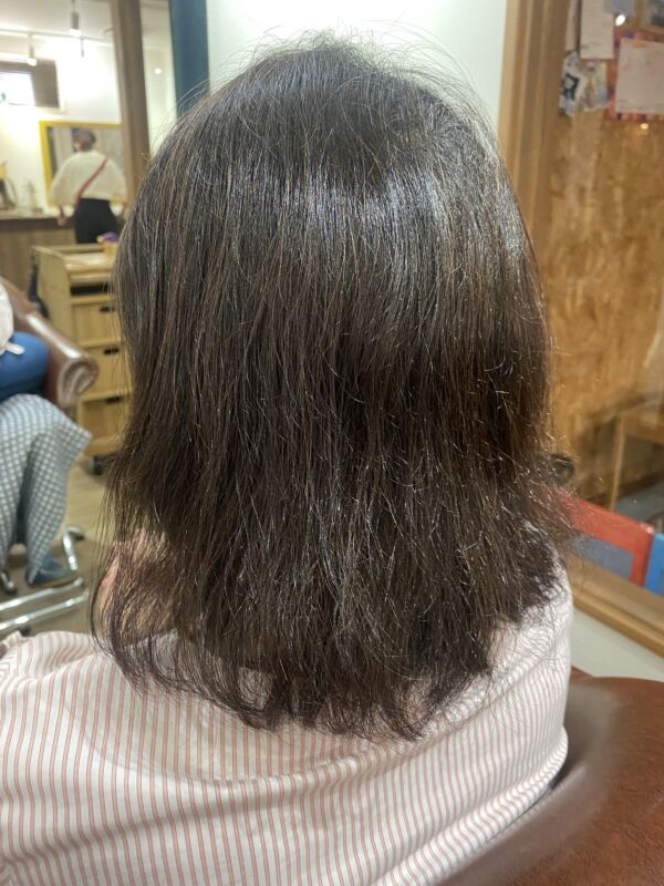 ララチッタに来店が3年ぶり。いろんな諸事情が重なりなかなか美容室に行けずの日々。気づけば髪がまとまらなくなってしまったとのこと。見るからに髪にハリコシ、艶が失われてしまったので、少しでも髪に元気になってもらえるメニューの提案で、酸熱トリートメントをオススメ致しました。
