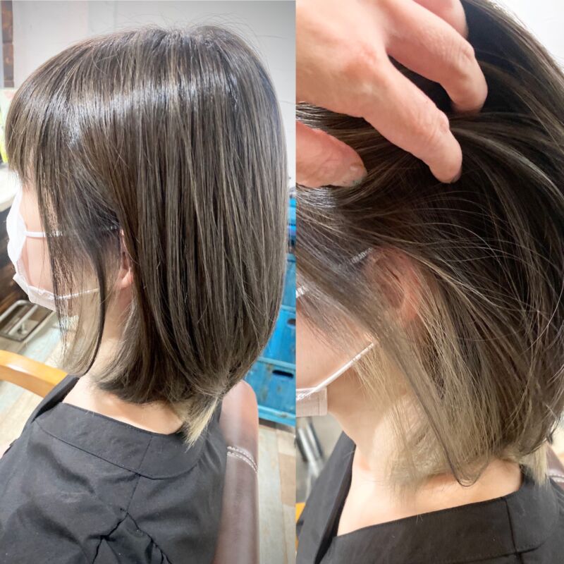 ブリーチなしではできないデザインですのでダメージは?と懸念される方も多いです。当店のブリーチ材は市販のものや、過去の物と違ってケアをしながらも色素を抜いてくれるものを使用しているので、思ったよりダメージ気にならないと言う方が多いです。