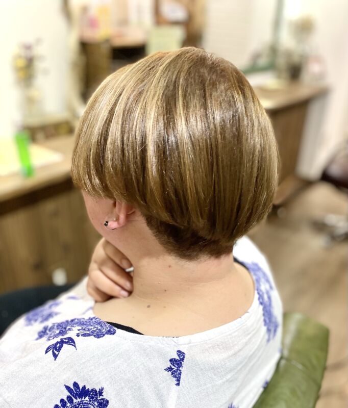 ショートのヘアデザイン、実は全頭ハイライト入れています。しっかり入れてあげることでショートヘアもメリハリがでます。今まではナチュラルなものが好まれていましたが、最近はよりデザインが明確になったものが人気です。私もしっかりデザイン入ってる方が好きかな😊✨ショートヘアの立体感がしっかり出ます。